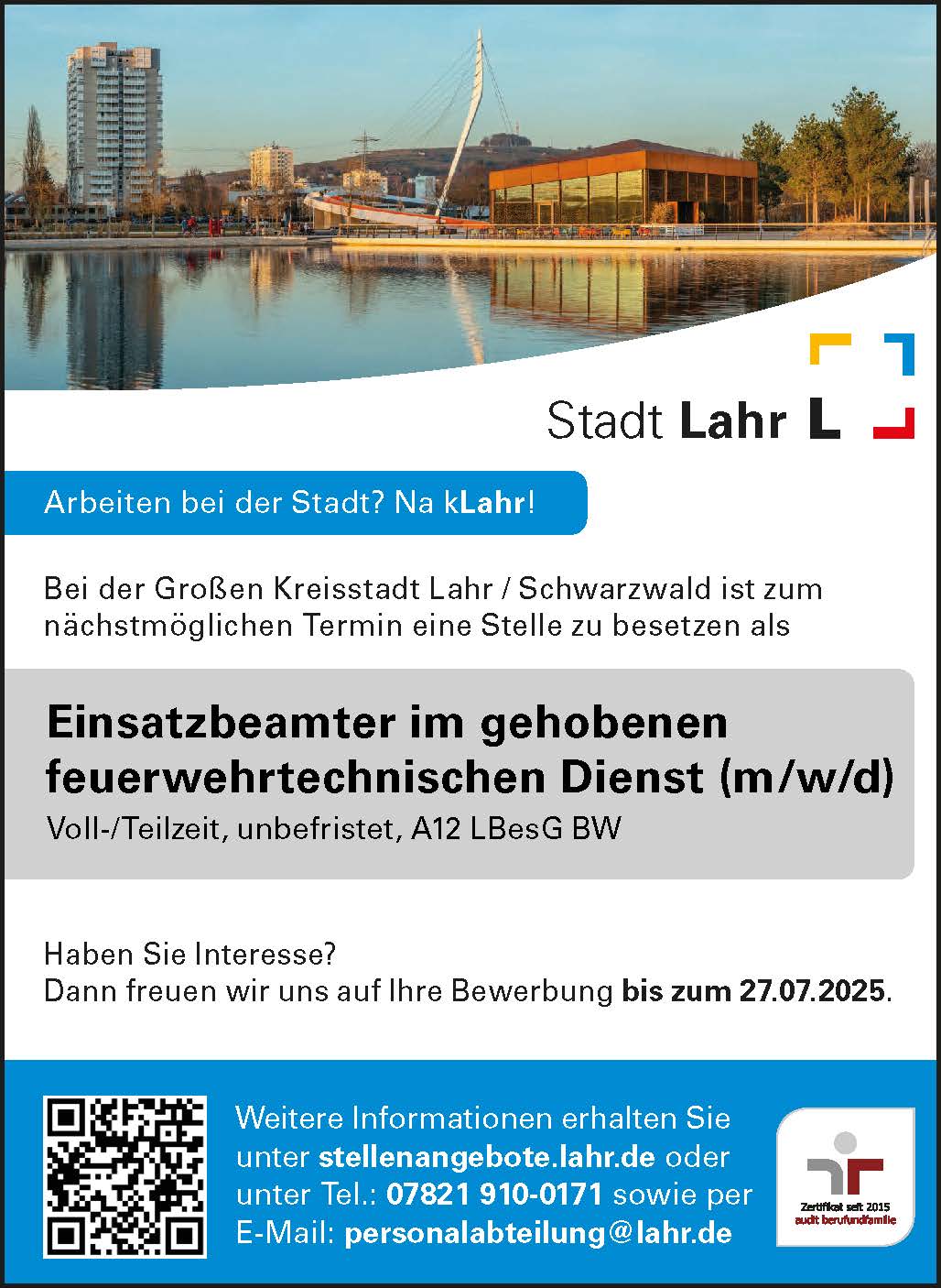 Weitere Informationen erhalten Sie unter stellenangebote.lahr.de oder unter Tel.: 07821 910-0171 sowie per E-Mail: personalabteilung@lahr.de